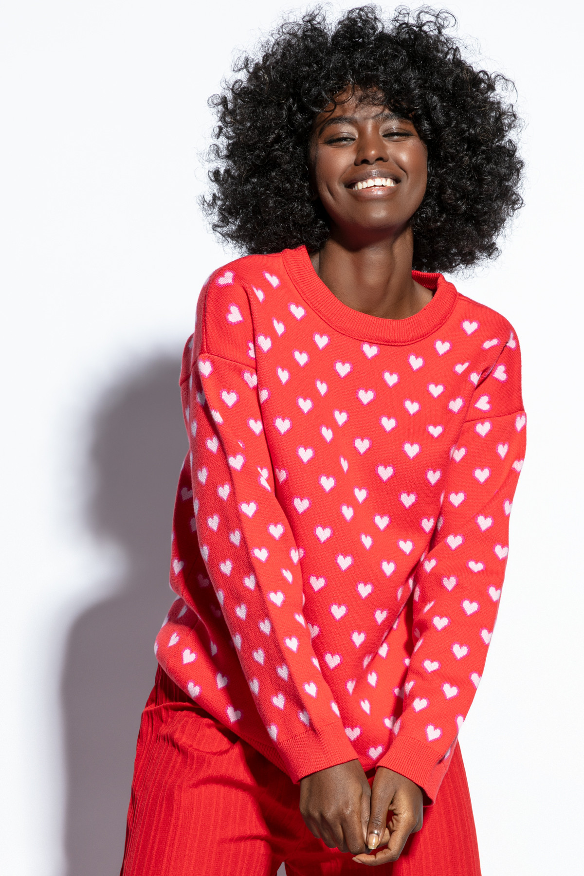 Bawełniany sweter w serduszka F1806 Swetry damskie FOBYA czerwony