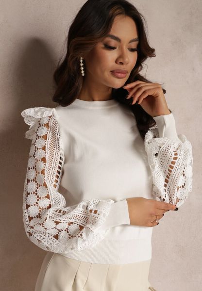 Biały Sweter Dzianinowy z Falbankami i Ażurowym Zdobieniem Halni Białe swetry nierozpinane damskie Renee, z aplikacjami, z dzianiny, casualowe, bez kołnierzyka, bez ramiączek. Za 119.99 zł. Swetry nierozpinane damskie