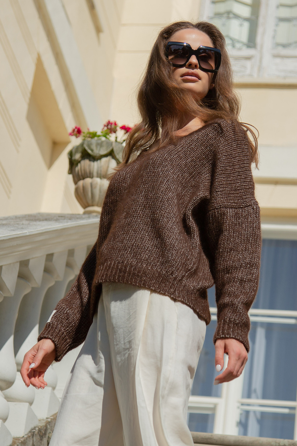 Klasyczny sweter z niefarbowanej wełny alpaki i bawełny mako brązowy