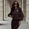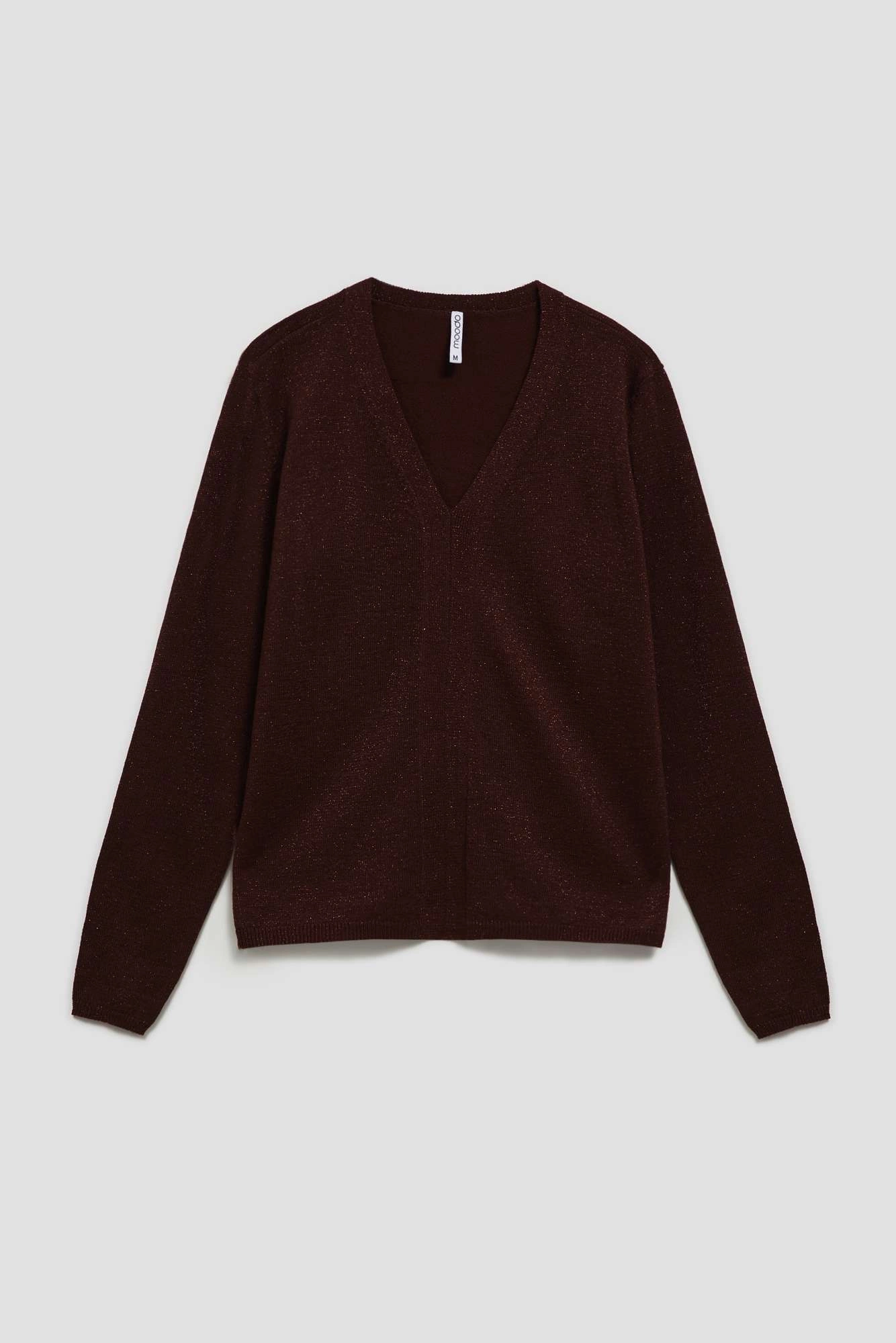 Sweter z metaliczną nitką i dekoltem w serek brązowy