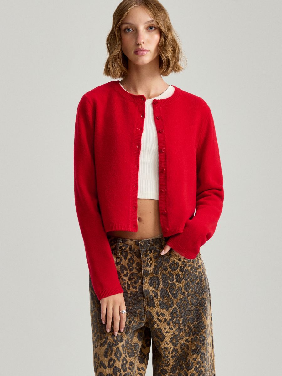 Czerwony cienki kardigan z zapięciem na drobne guziczki