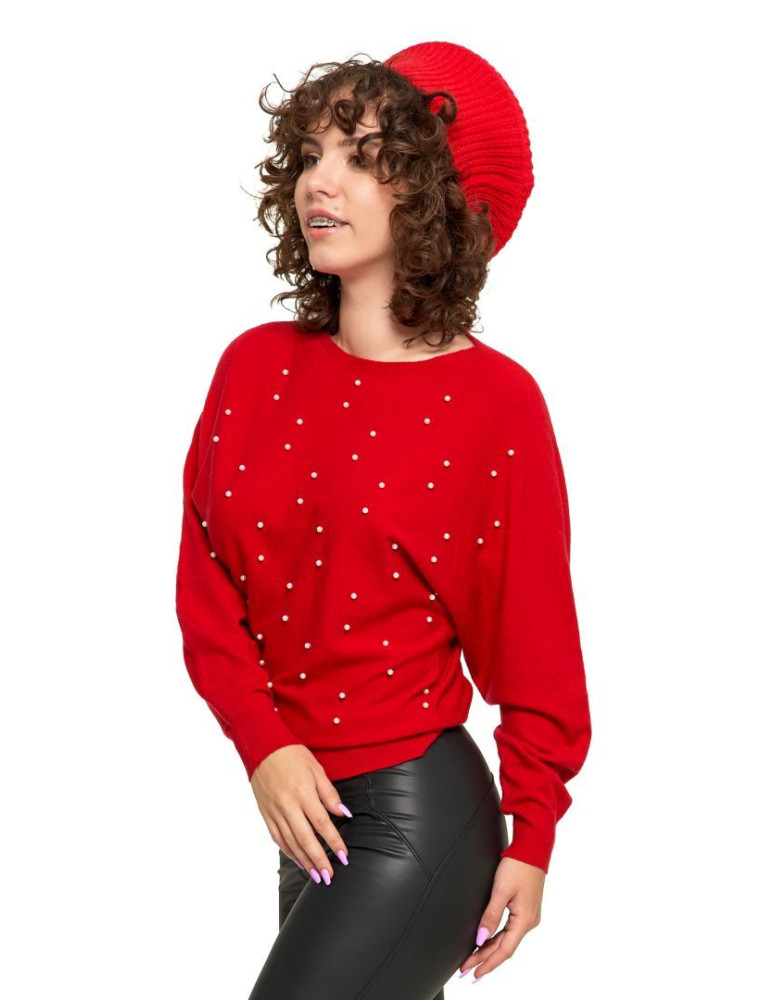 Sweter damski z perełkami i kimonowym rękawem CZERWONY sklep Moraj