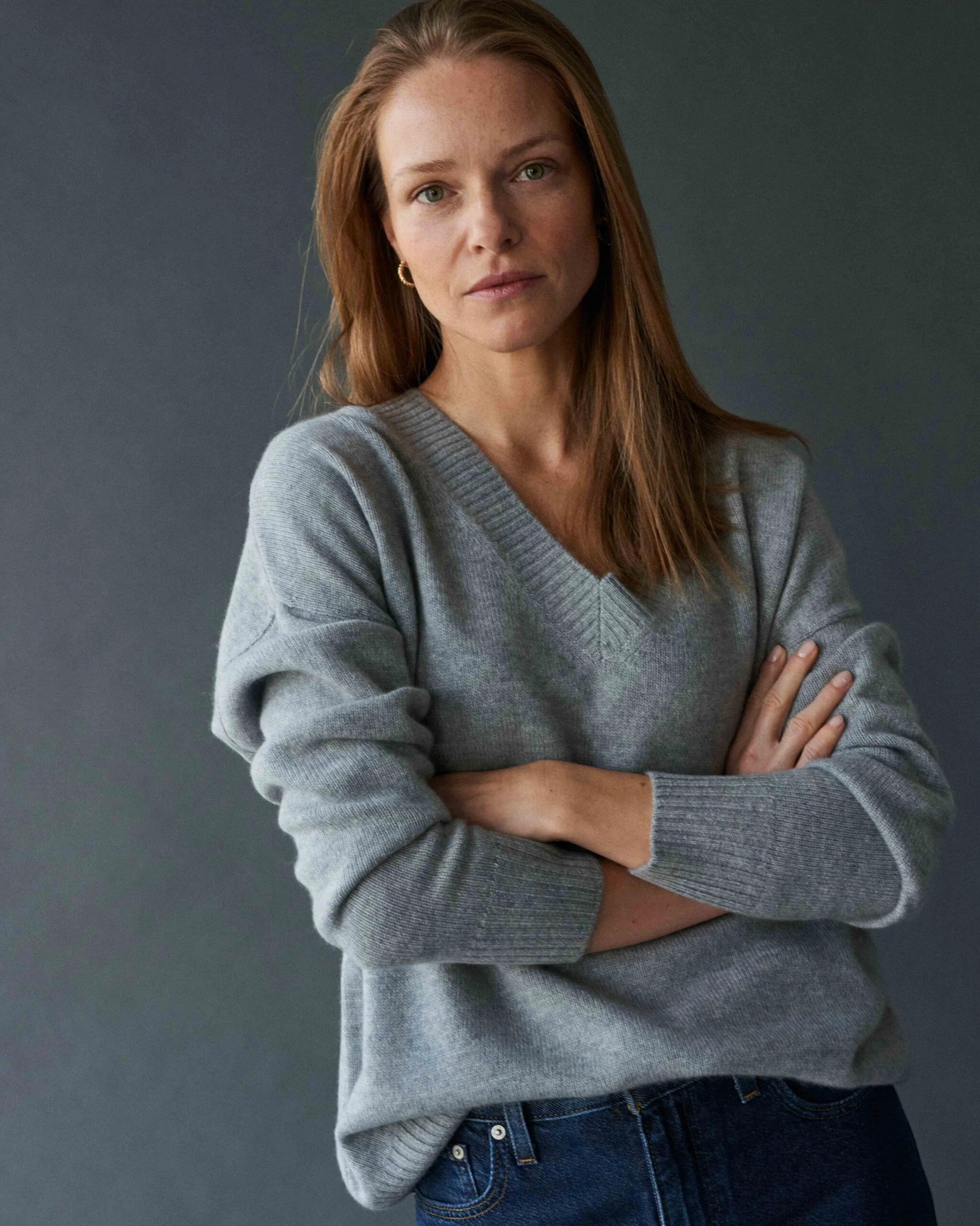 ELIA kaszmirowy sweter z dekoltem w serek jasnoszary