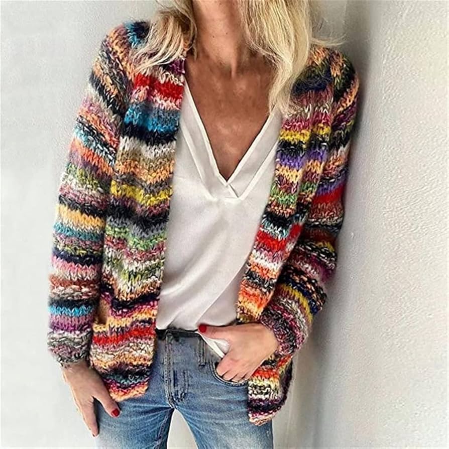 Sweter Damski Sweter, Wielokolorowe Paski Z Dzianiny Na Co Dzień Z Długim Rękawem Kolorowe Swetry Z Dzianiny Topy Otwórz Przód Luźna Kurtka Znosić Na Jesień Zima Wiosna (Color : Red, Size :
