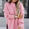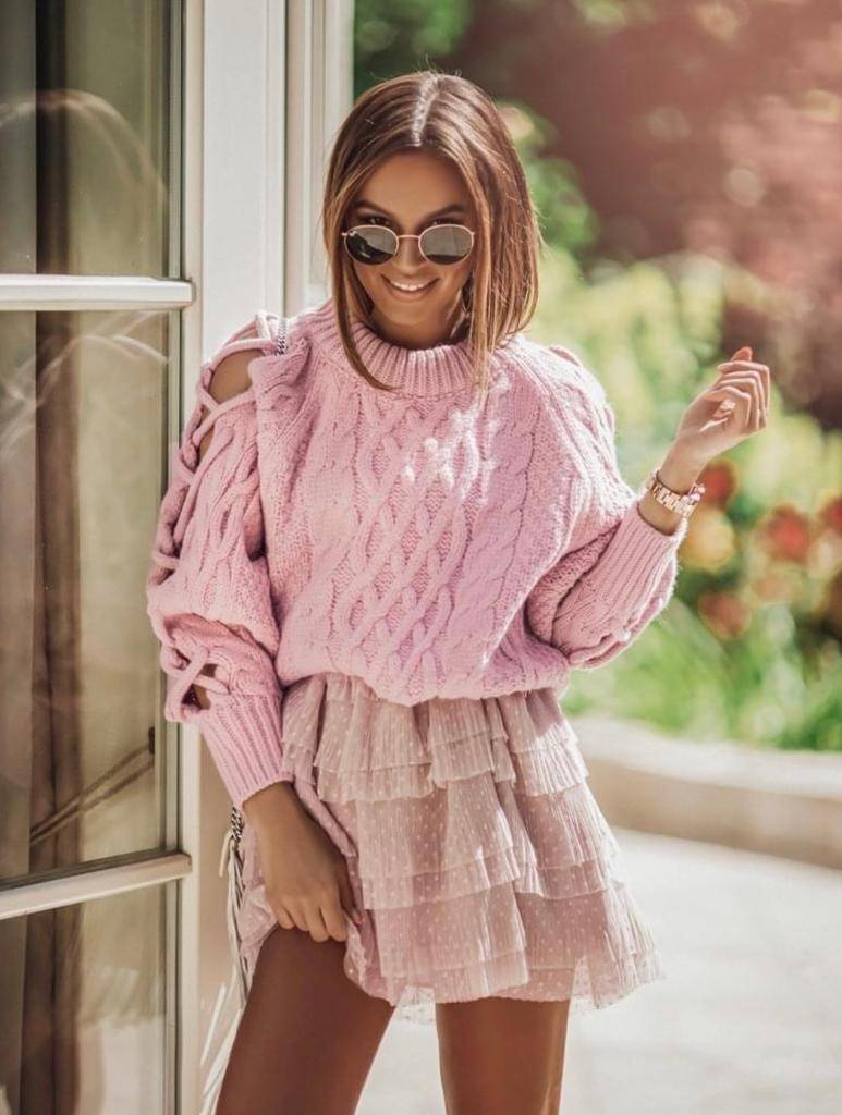 Różowy sweter damski AUTUNNO II by COCO, zdobiony na ramieniu.