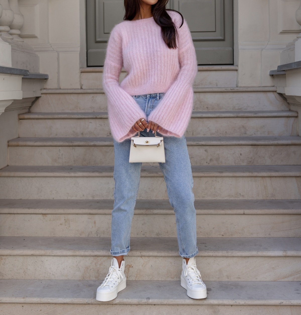 Sweter dzwonkowy moherowy pudrowy róż super kid mohair pastel Sky Second Hand