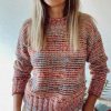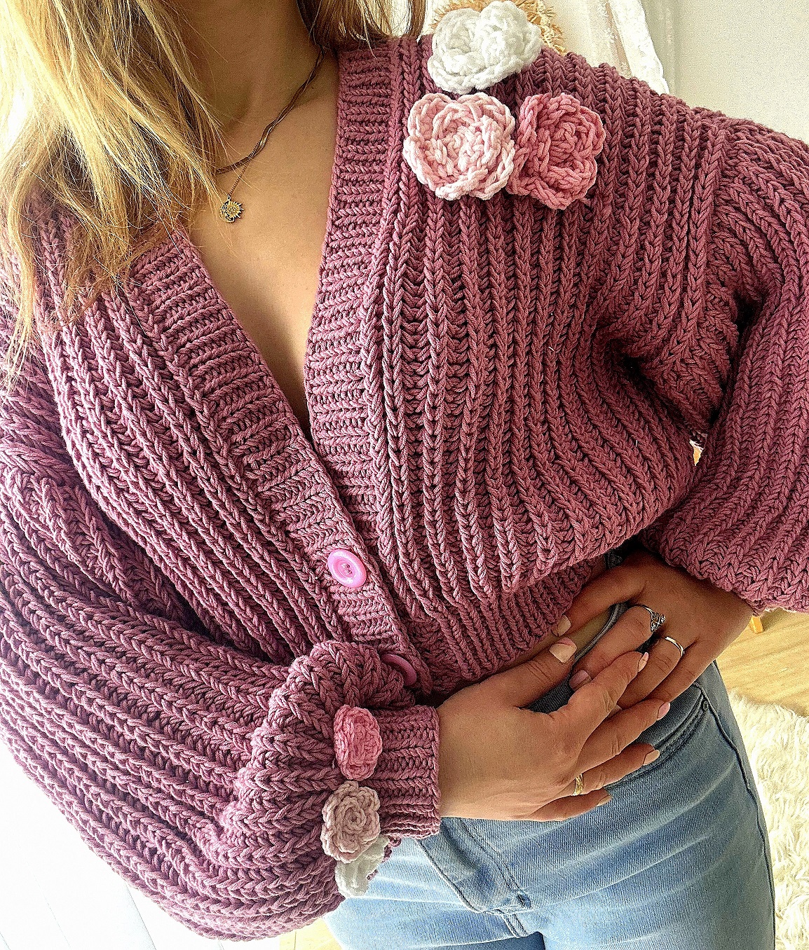 Sweter na drutach z kwiatami, kardigan oversize różowy wrzos