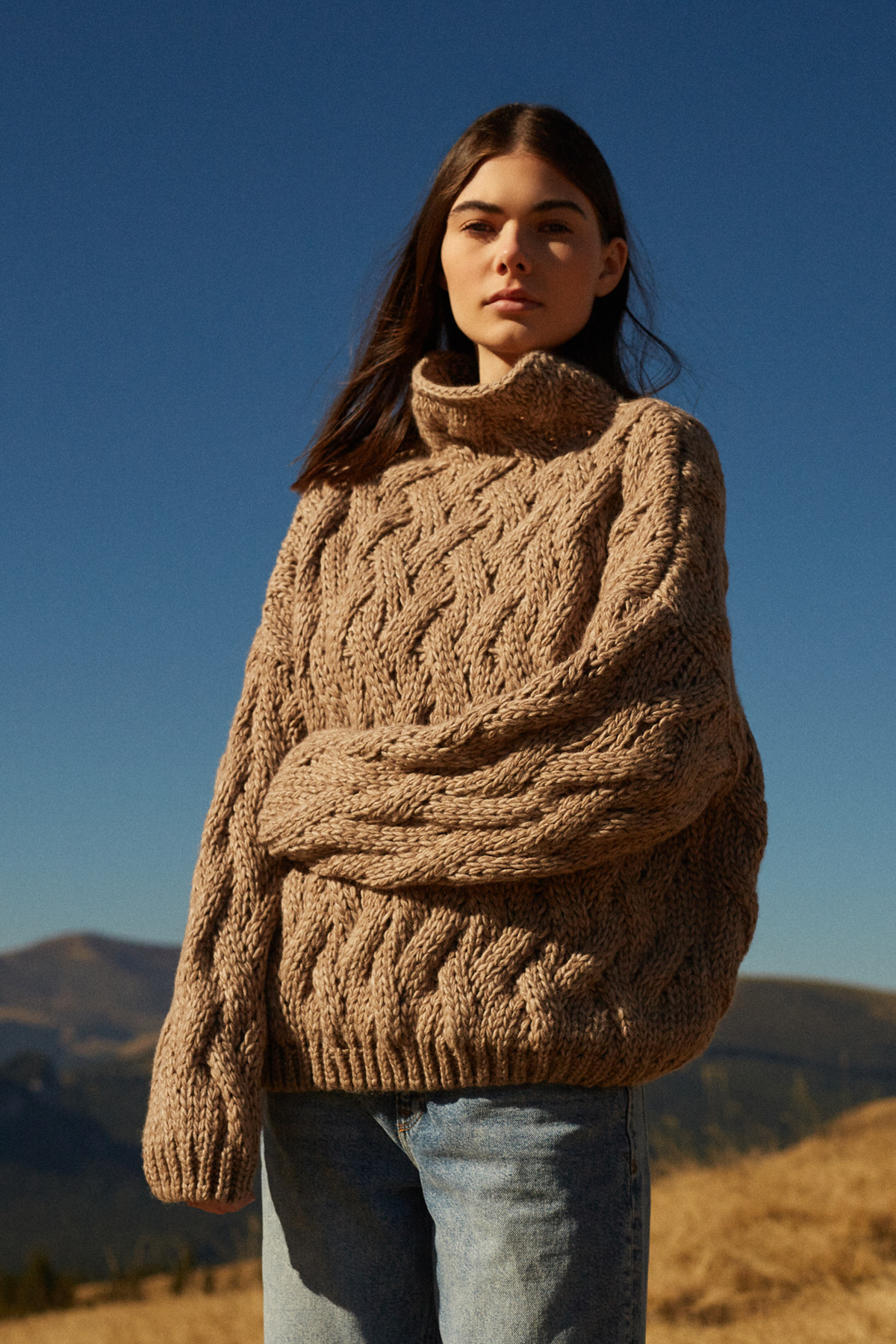 Sweter wełniany gruby z warkoczowym splotem F839 mocca