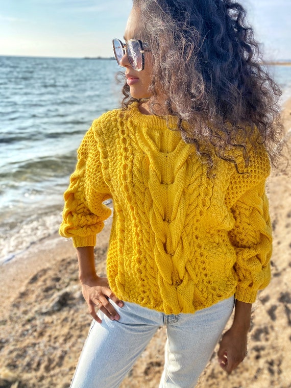 Żółty sweter robiony na drutach ręcznie z miękkiej wełny dla kobiet Oversize’owy sweter damski z dzianiny z rękawem trzy czwarte Gruby sweter w kolorze cytrynowym Etsy Polska
